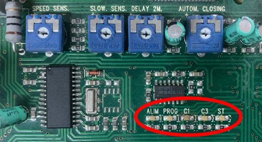 - Si un code défaut s'affiche ou si la ou les LED ROUGE / D1 / D2 / D3 / C1/ C3 / C7 /C8 / CY / CX / ST / STOP / PROG s'allument ou clignotent, votre portail est surement en erreur ( cellules de sécurités, bouton stop, mauvais configuration ) ce référer à l'aide ci dessous et notice de votre carte.
